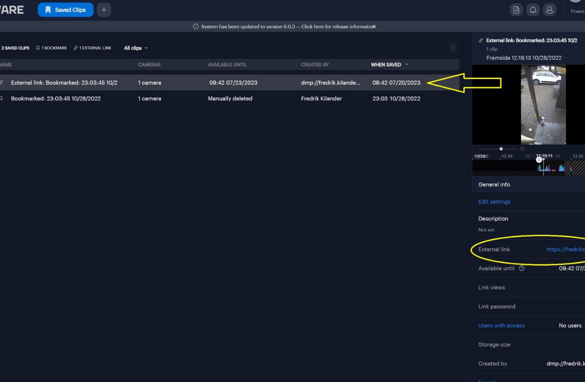 Under Saved Clips har det skapats en ny rad som börjar med “External link:”. Klicka på denna rad och klicka sedan på länken. Länken kopieras då till datorns urklippsminne, välj klistra in i till exempel ett mejl.