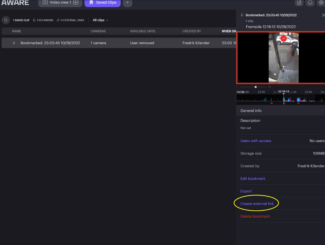Skapa en extern länk som du kan dela med andra, genom att välj det bokmärkta klippet och tryck på Create external link.