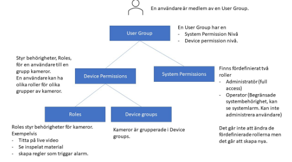 För att visa hur dessa fungerar ska vi som exempel skapa ett konto åt en butiksvakt. I detta exempel vill vi att butiksvakten ska kunna se live videofrån kamerorna, men inte inspelat meterial. Och hen ska endast kunna se kameror i butiken och kassorna, inte kameror på lager och kontor.