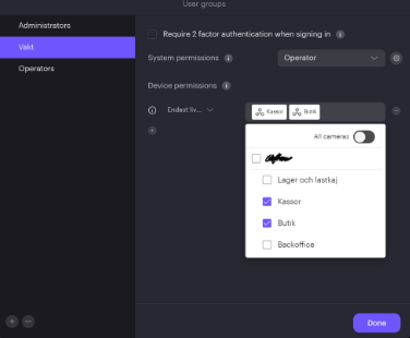 Välj de kameror som medlemmar i denna grupp ska få lov att titta på. Detta förutsätter att det redan finns “Device groupes” för Kassor och Butik.